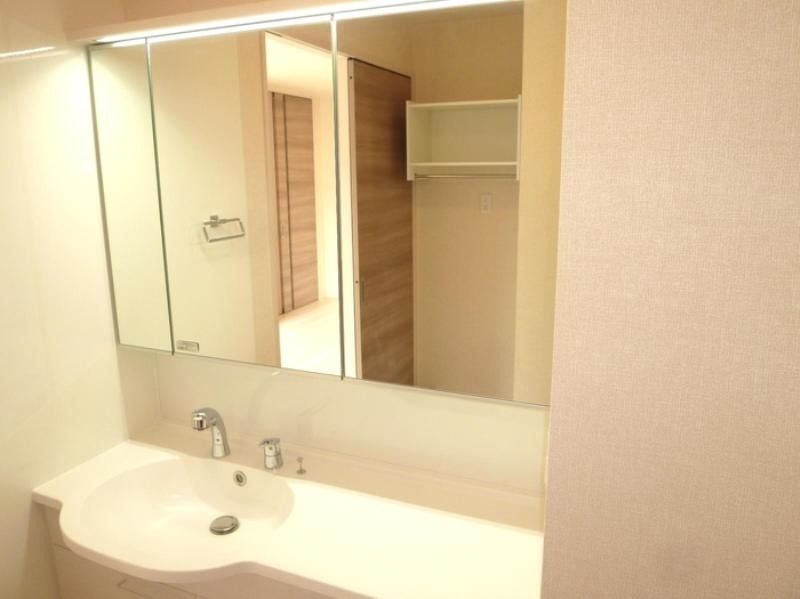 三面鏡の作りとなっていまして、洗面台は広い丸型の物になっていますし、隣に物を置けるスペースがあるので女性の方にも嬉しい造となっています。