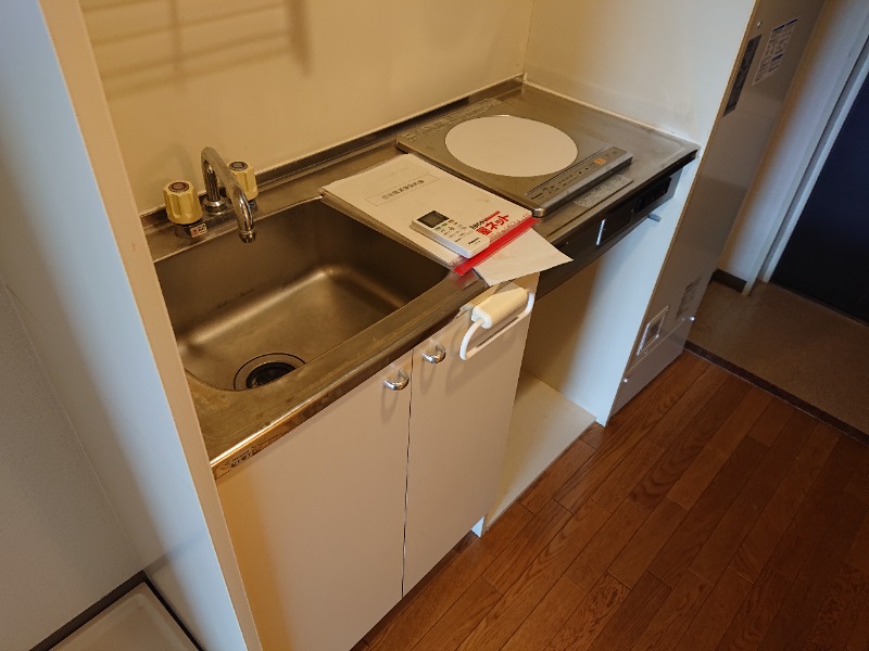 キッチンはIH1口コンロが設置済み。収納スペースやミニ冷蔵庫置き場も備わっています。