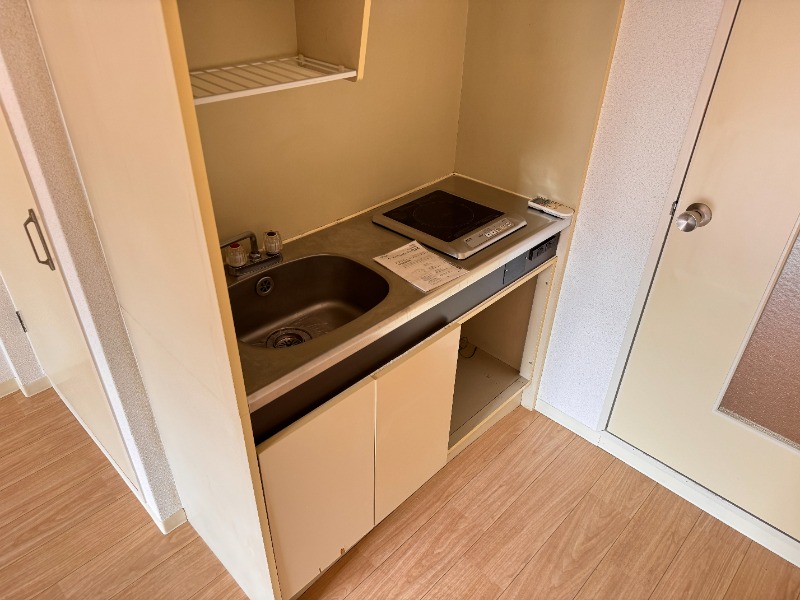 1口ガスコンロ設置済みのミニキッチン!下部には収納スペースとミニ冷蔵庫置き場です!