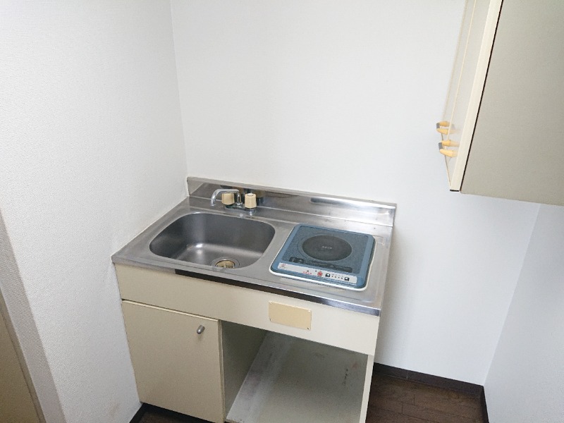 電気コンロと洗い場、下に収納があります。