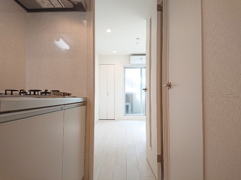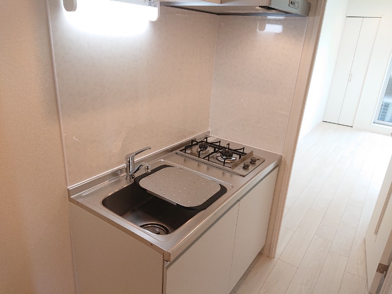 入口すぐにキッチンがあり、2口コンロで洗い場もしっかりとあります。