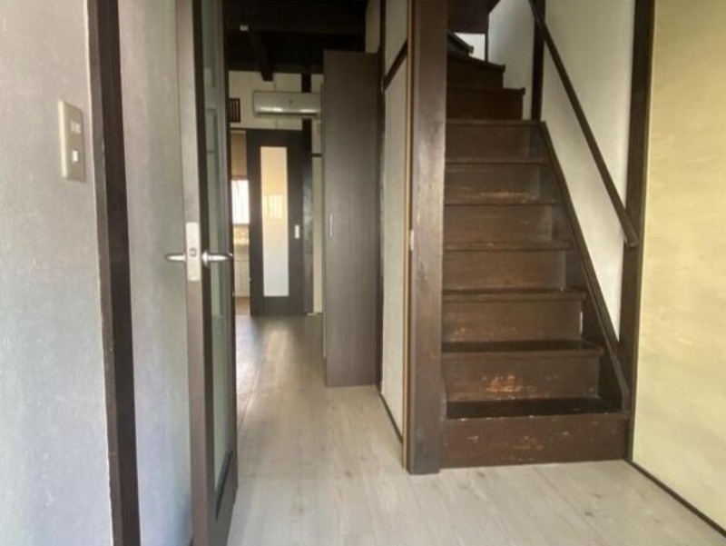 中に入ると、右手に階段があって、玄関からメインの部屋はドアが付いていますので、宅配や少しの来客であれば、ドアを閉めれば部屋の中が見えてしまう心配もないです。