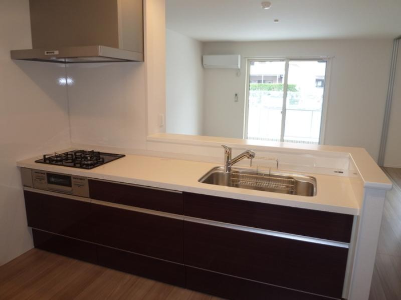 二人入居可、システムキッチン、給湯、追焚機能、シャワー付洗面化粧台、床下収納、CATV、宅配ボックス、駐輪場あり、角部屋、温水洗浄便座、カウンターキッチン、浴室乾燥機、洗面所独立、全居室収納、クローゼット、シューズボックス、保証人不要、水道(公営)、ガス(都市)、排水(下水)、バス・トイレ別、シャワー、ガスコンロ、コンロ(三口)、エアコン、室内洗濯機置き場、オートロック、フローリング、TVドアホン、インターネット使用料無料、セキュリティ会社、最上階